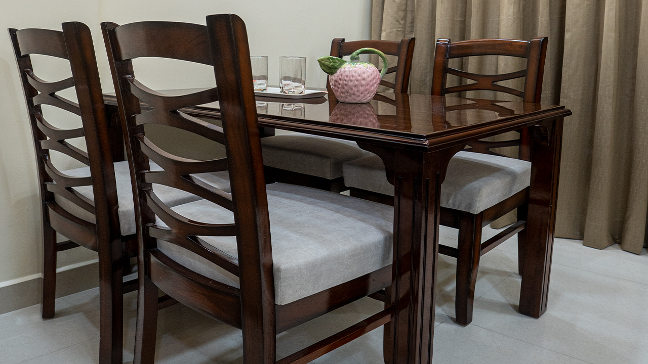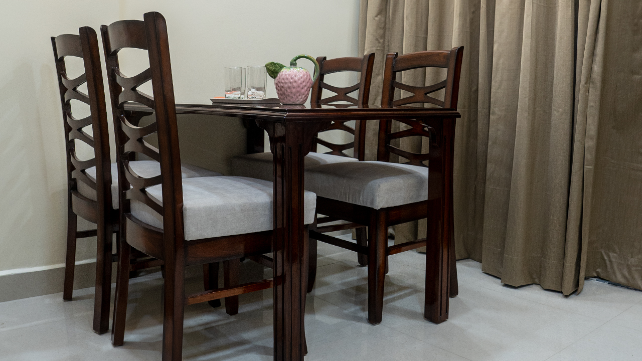 "Elevate your dining experience with our sophisticated dining table and chairs set, perfect for intimate gatherings and everyday meals. Crafted with dark wood, this set exudes warmth and refinement, complementing any home decor. Made from high-quality dark wood, the table boasts a sturdy construction and a smooth finish. Its compact size makes it ideal for small dining areas or kitchens. Four matching chairs with a unique lattice design on the backrests add a touch of elegance. The chairs feature comfortable cushions upholstered in a light-colored fabric, ensuring a pleasant seating experience. The set's classic design ensures it will remain stylish for years to come. The dark wood tone pairs well with a variety of interior styles, from traditional to modern."