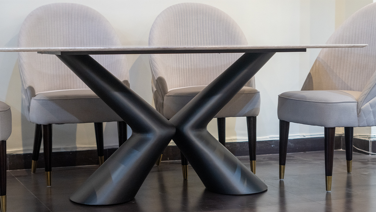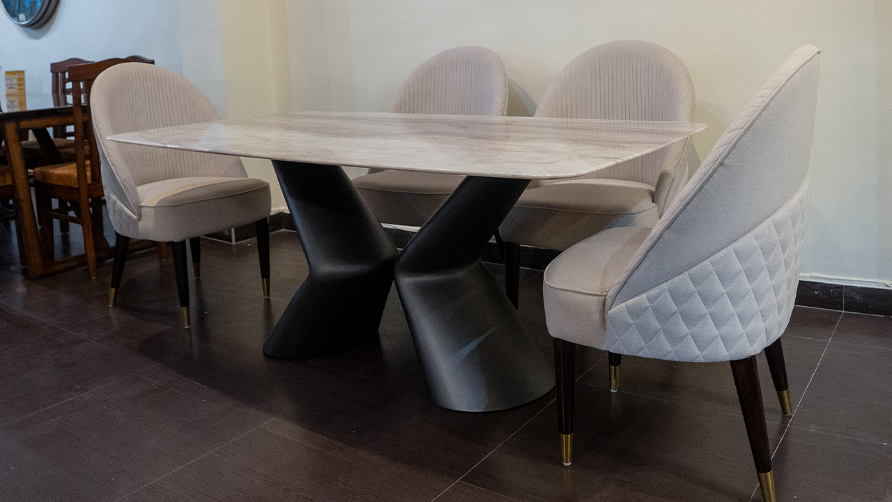 "Experience the epitome of luxury and sophistication with our exquisite dining table and chairs set, meticulously crafted to elevate your dining experience to new heights. Perfect for intimate gatherings, special occasions, and everyday meals, this stunning ensemble is sure to impress. The table boasts a beautiful light-colored wood top, adding warmth and invitation to the space, while its unique X-shaped black base provides stability, style, and a touch of modern elegance. The durable construction ensures long-lasting use, making it a valuable addition to your home. The four matching chairs are true masterpieces, featuring light-colored upholstery with a quilted design that exudes comfort and refinement. The high backrests provide ultimate support and comfort, while the tapered legs with gold accents add a touch of sophistication and glamour."