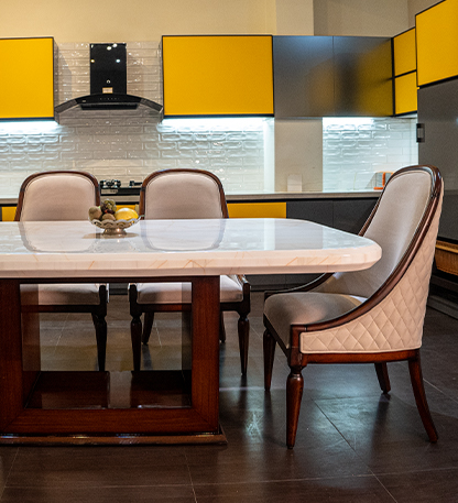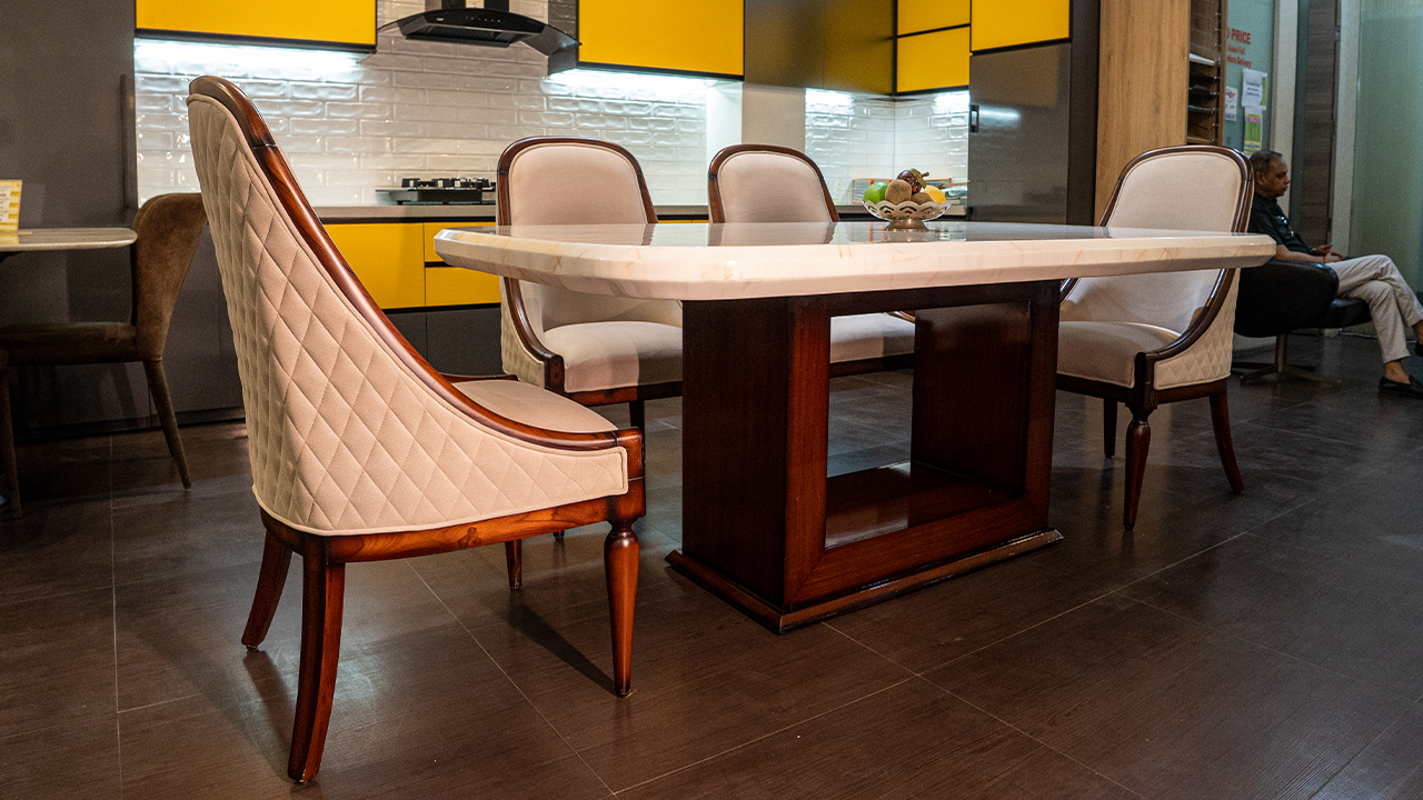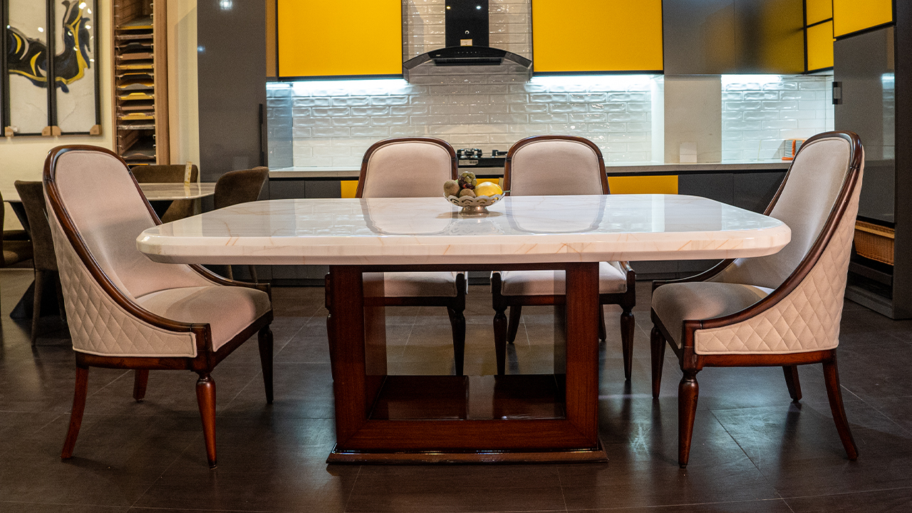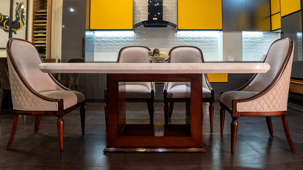 "This sophisticated dining table and chairs set is perfect for creating unforgettable memories with family and friends. The table features a stunning white marble top, exuding luxury and refinement, paired with a dark wood base that adds warmth and depth to the overall design. The four accompanying chairs boast light-colored fabric upholstery and dark wood frames with curved backs and arms, providing both comfort and style. The combination of materials and clean lines creates a modern and stylish look that's perfect for any dining room. Whether you're hosting a formal dinner party or enjoying a casual meal, this elegant dining table and chairs set is sure to impress. With its durable construction and timeless design, this set is a great investment for any home. Bring a touch of sophistication to your dining room with this beautiful table and chairs set."