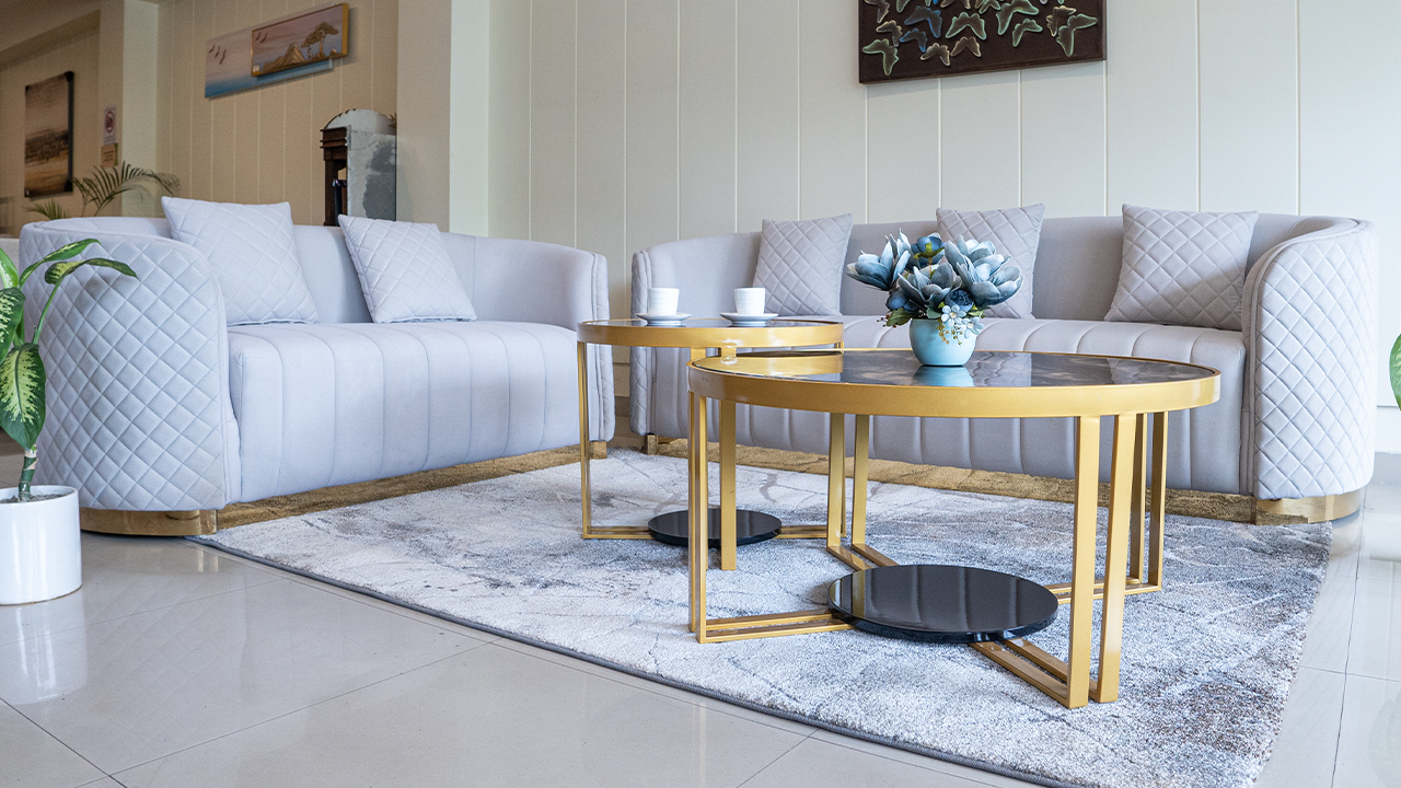 Add a touch of modern sophistication to your living room with this exquisite 3+2 seater sofa set. Featuring a graceful off-white hue and luxurious velvet upholstery, each piece is designed with finely quilted armrests and back cushions for a timeless, upscale look. The soft padding and deep seating promise unmatched comfort, perfect for both everyday lounging and formal gatherings. The set is beautifully complemented by dual circular center tables with a rich black marble finish and stunning gold metallic frames. Set atop a plush area rug, the ensemble exudes class and comfort while making a bold design statement. Ideal for contemporary and classic interiors alike, this sofa set elevates any space with elegance, functionality, and style.