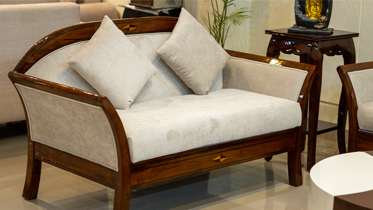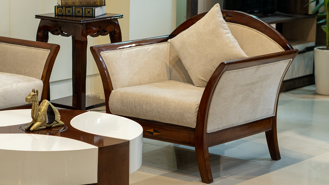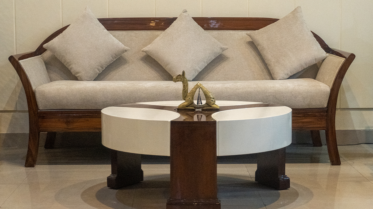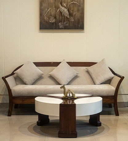 Refined elegance meets timeless craftsmanship with this wooden frame sofa set, crafted to elevate both traditional and modern interiors. The design features a solid polished teakwood frame with beautifully curved armrests, offering a rich and natural finish that complements the soft, neutral-toned upholstery. Paired with matching plush cushions for added comfort, this 3-seater is ideal for compact living rooms, reception spaces, or boutique lounges. The set is perfectly accented with a modern circular center table, designed with a high-gloss finish in white and walnut tones. Its symmetrical split design adds visual interest and functionality — a conversation piece in itself.